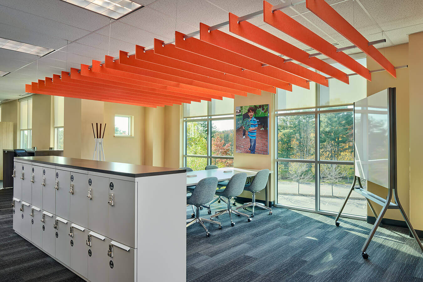 A dated workplace is reimagined as a thriving, open and collaborative workplace for a confidential financial services client. The existing space, housed in a 3-story suburban office building, was built on a one-to-one workstation layout with 65 inch tall divider panels. The tall panels hindered communication, obscured views and hindered access to natural light form penetrating beyond the perimeter circulation.