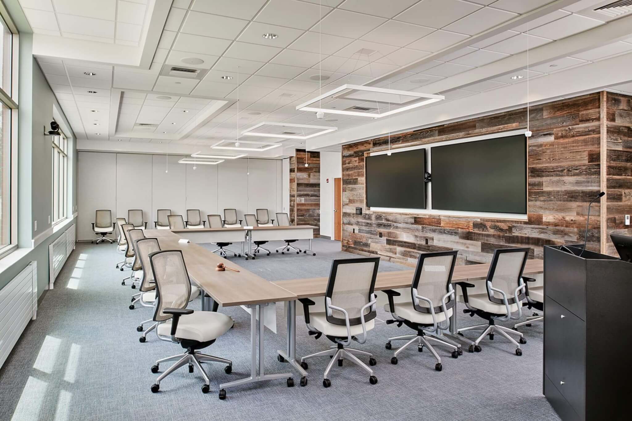 To support the client’s business, operations, and culture, we planned “neighborhoods” connected by managerial offices. This interconnected layout softened the existing structure and opened the space to collaboration. Employee wellness and comfort were also central to the design concept: expansive exterior vertical windows and skylights flood the space with natural light.