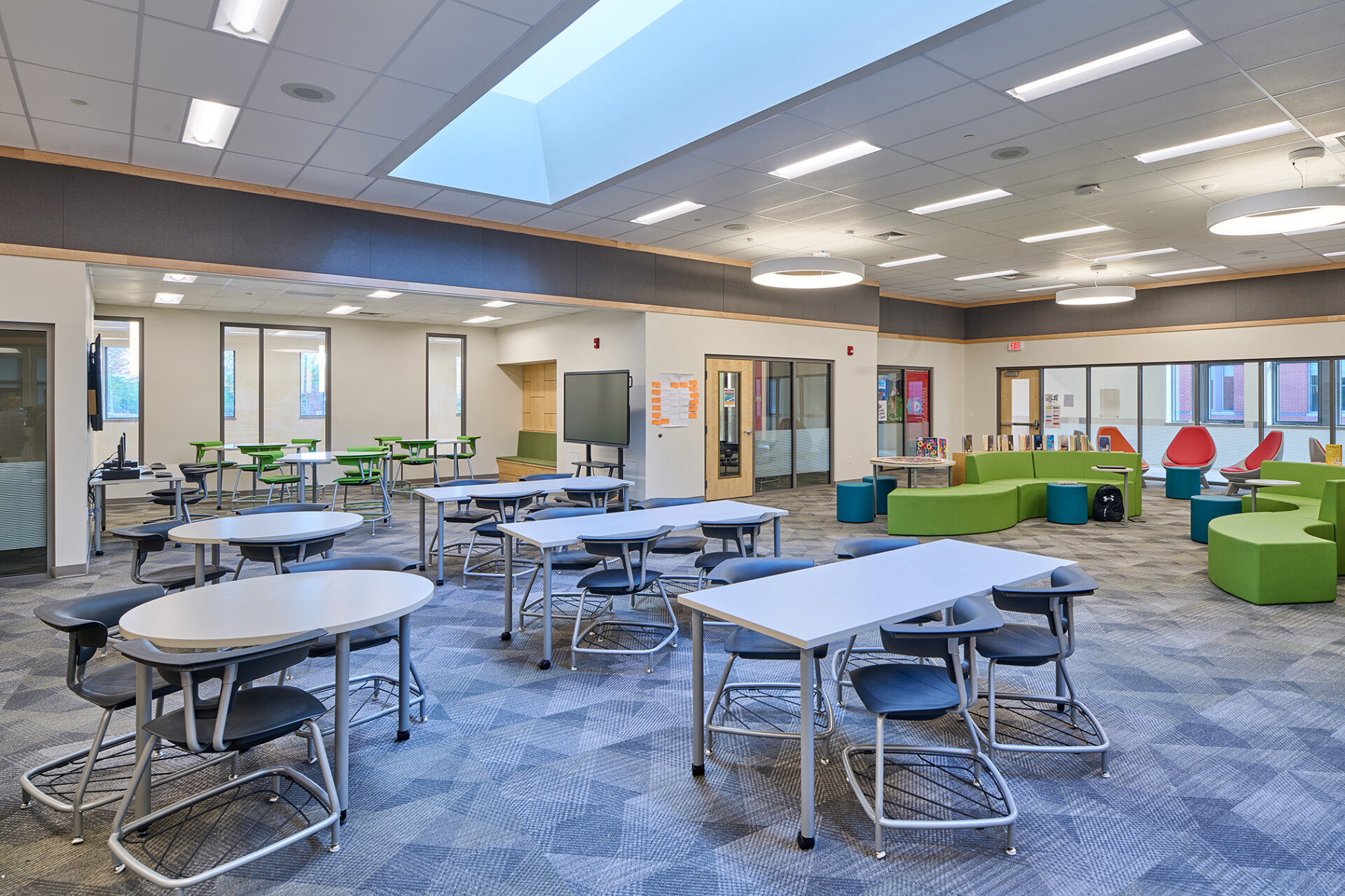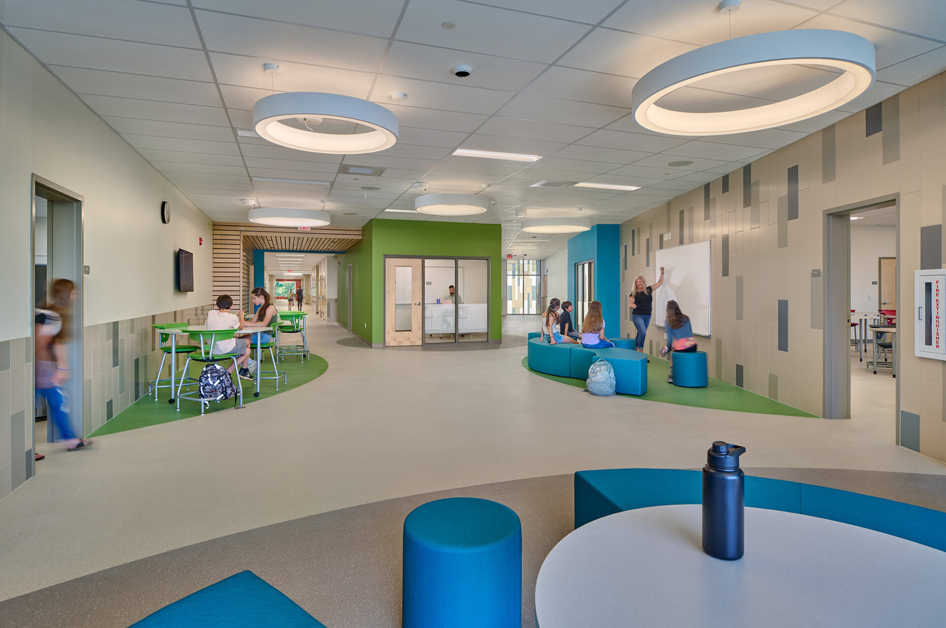 The design of the new Nashua Middle School is derived from the desire to create academic “villages” centered around a “learning hub”. These academic studios provide a common agile collaborating and gathering area to establish a smaller community of students and teachers to develop social connections within the context of the larger school. The learning hub is a space filled with break out rooms, an array of flexible furniture, interactive technology and small group collaboration areas.