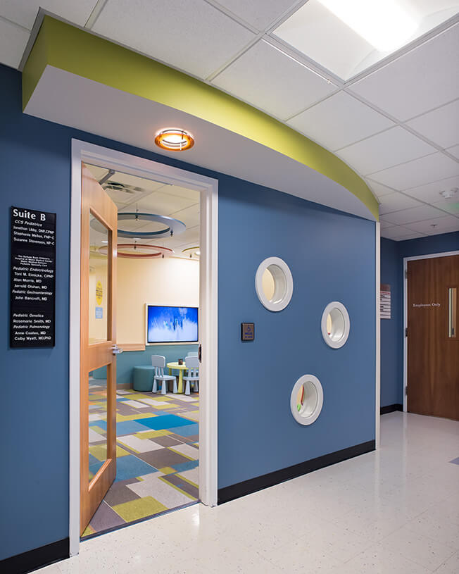 A visit to the hospital for both healthy and ill children can be a scary experience. Our design team adopted a child’s eye perspective to create a non-threating and welcoming place for families. Defined by playful forms, vibrant colors and whimsical detailing, this imaginative new Pediatrics suite helps take the stress out of a visit to the hospital.